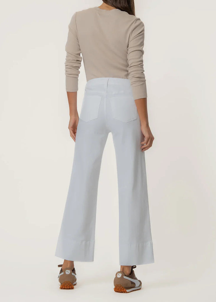 - Elevate your look with our high-rise wide leg pants in sleek optic white. Designed with a refined wide hem and stylish front pin tuck, they offer a clean, modern silhouette. Made from a stretchy material for all-day comfort, these pants deliver the perfect blend of structure and ease. Ideal for effortless everyday style.