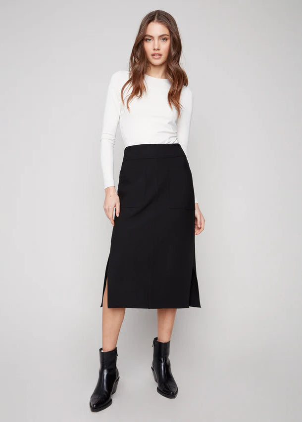Discover our Gutsy Crepe Skirt, showcasing a sleek black design with front patch pockets and side slits for modern elegance and practicality. The robust crepe fabric with a hint of stretch ensures a comfortable and flattering fit, making it a must-have for any fall wardrobe.