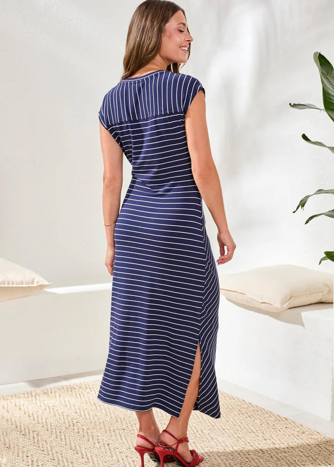 Crafted from soft striped mini French terry, this pull-on maxi dress blends comfort and polish with ease. Designed with cap sleeves and a flattering side knot detail at the waist, it creates natural shape without added bulk. The diagonal stripe pattern elongates the silhouette, while the stretchy fabric and side slit offer effortless movement—perfect for resort days, travel, or springtime gatherings.