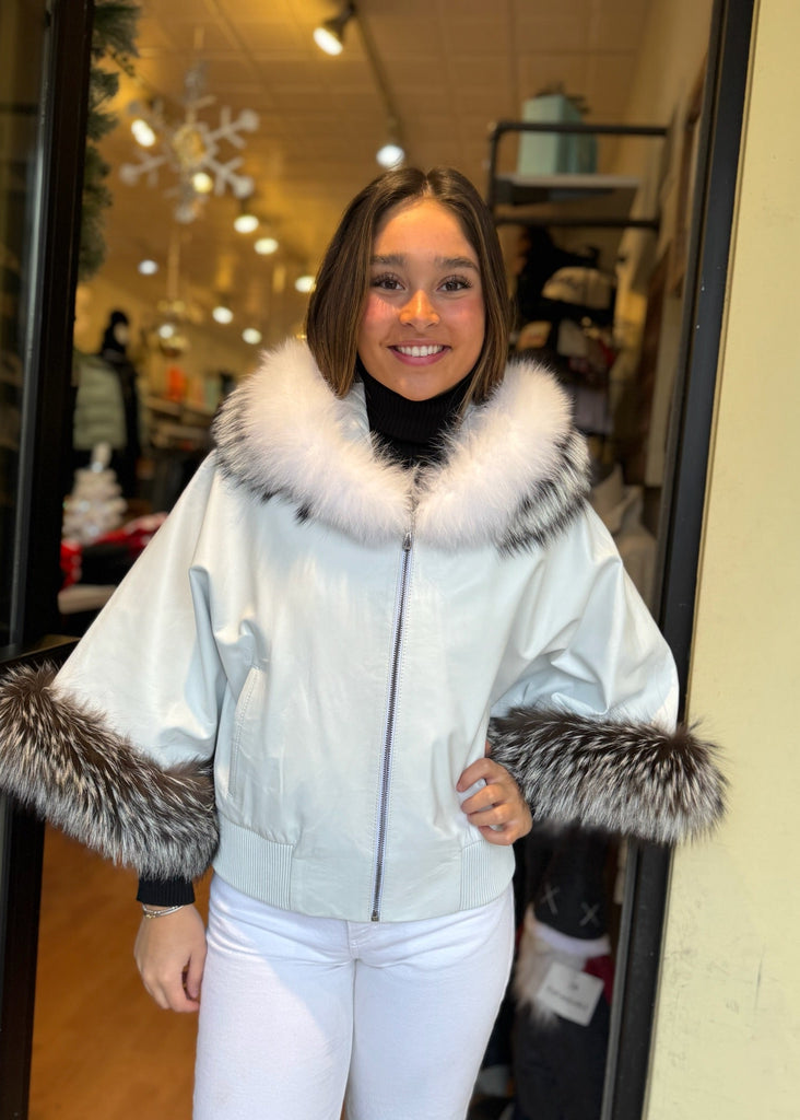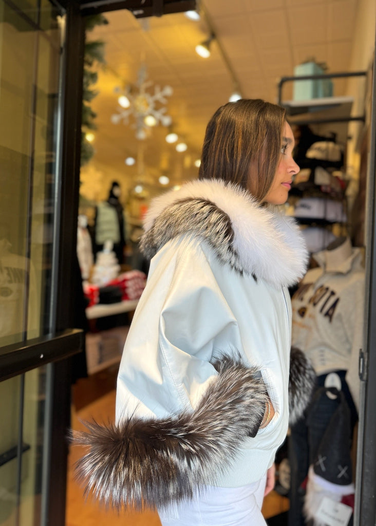 LEATHER JACKET WITH SILVER FOX FUR CUFFS & 2 TONE FOX TRIM ON HOOD