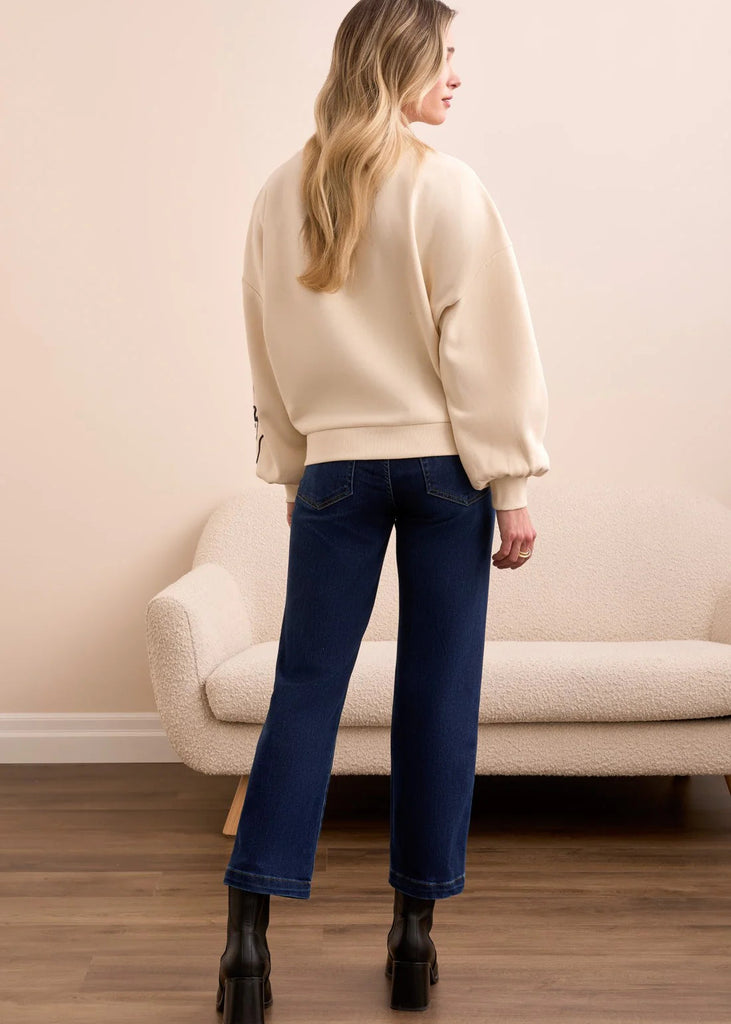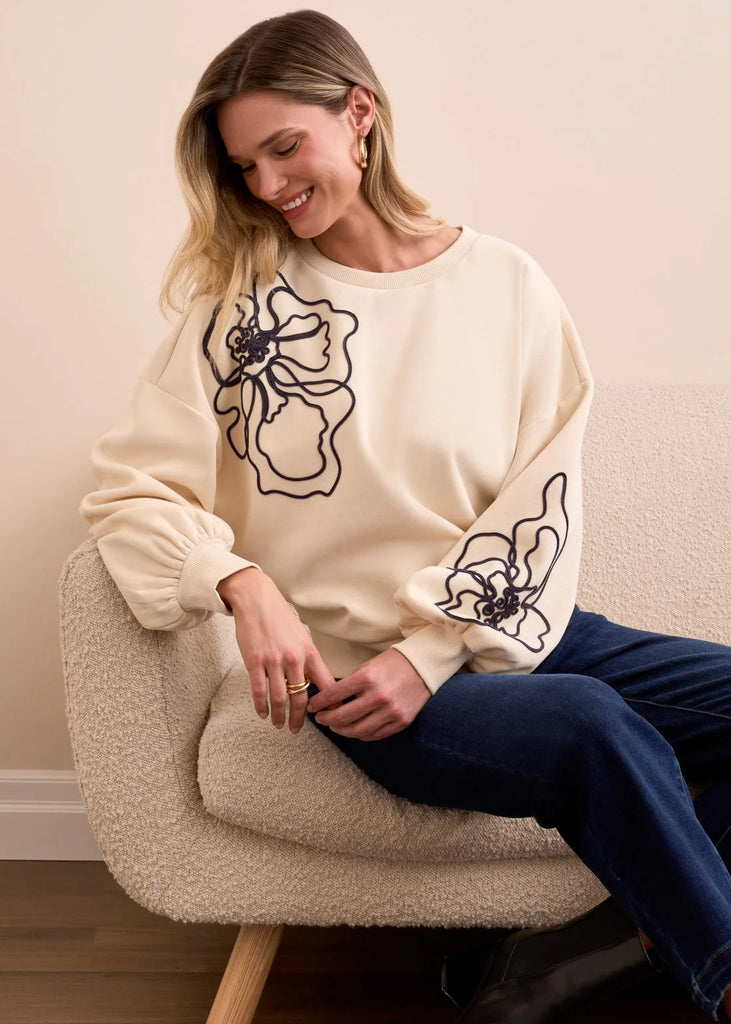 Floral embroidery gracefully adorns the shoulder and sleeve of this relaxed top, adding a touch of sophisticated charm. Crafted from brushed-back French terry fabric, it combines cozy comfort with a chic, fashion-forward look perfect for everyday wear.